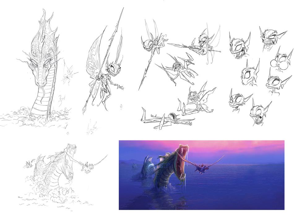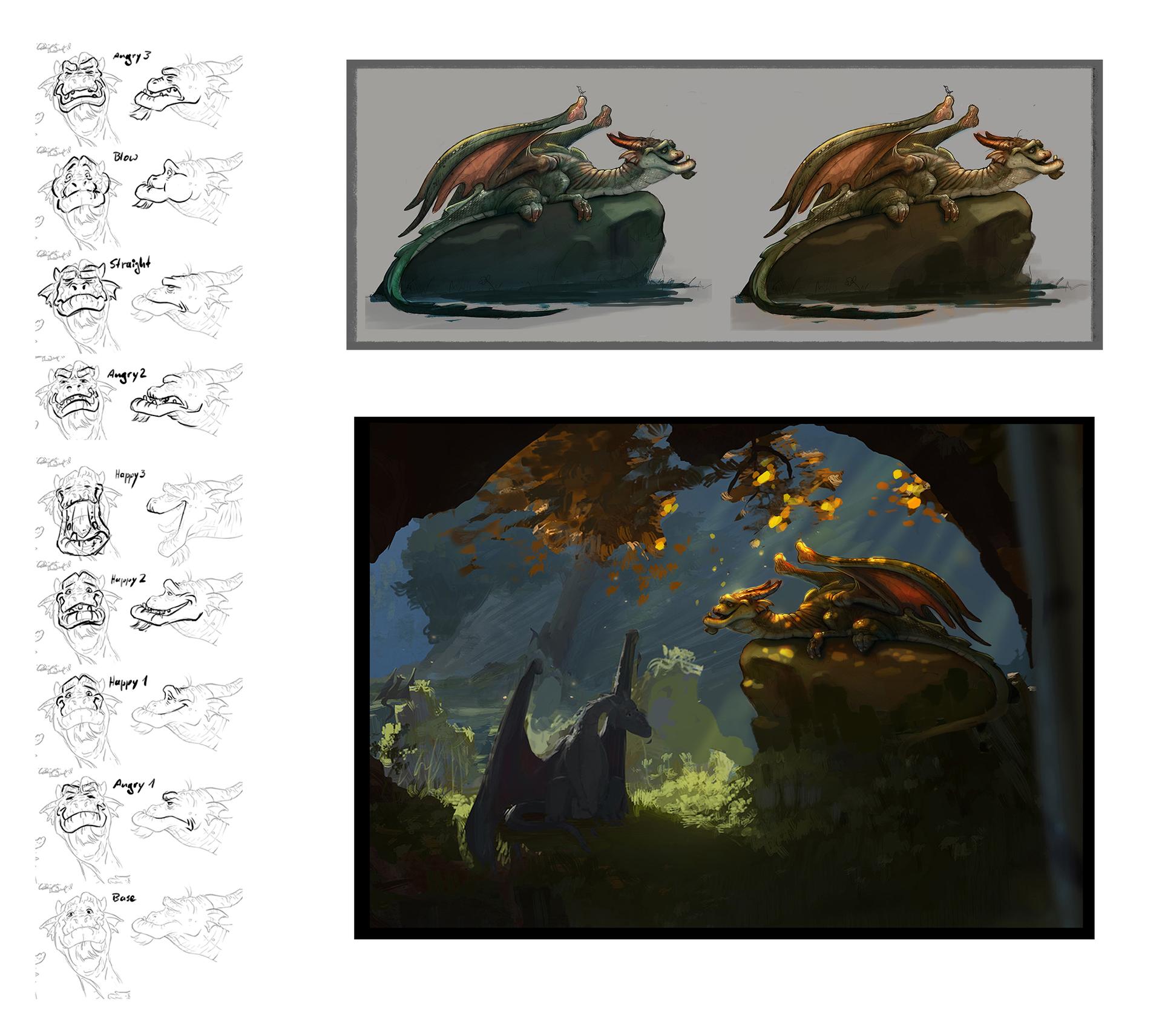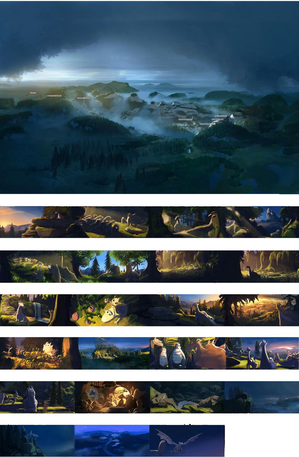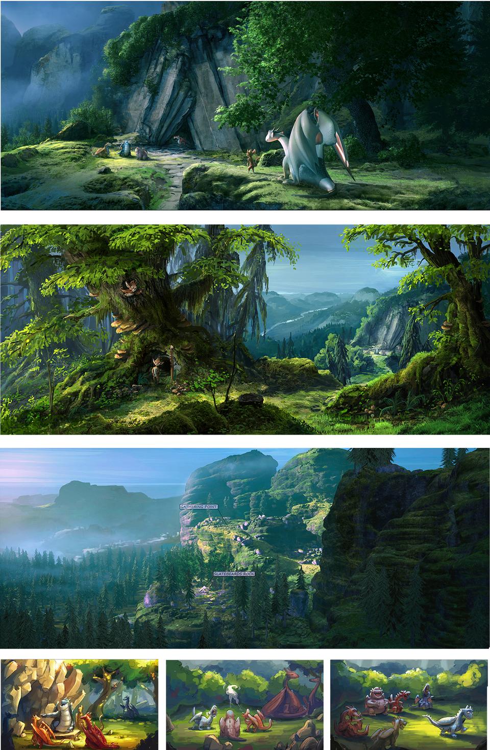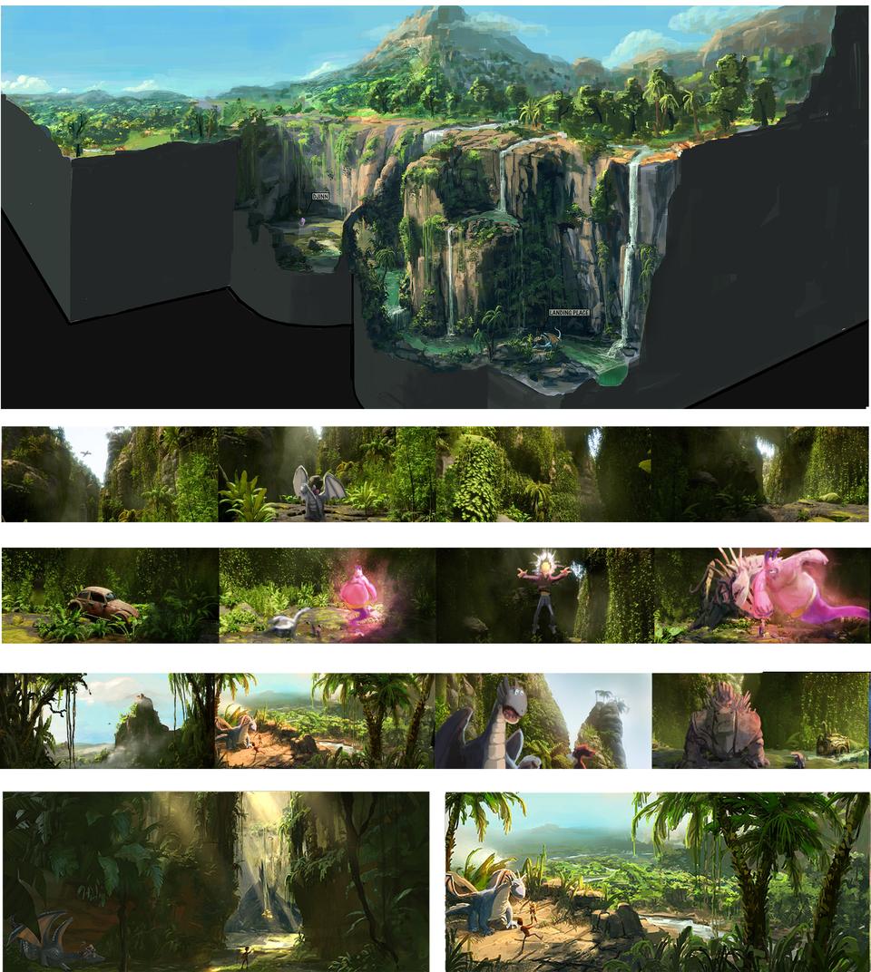 The Valley of the Dragons was challenging in many ways. On the one hand because most of the places are played here, on the other hand because it should actually be an uncomfortable place that the dragons want to leave, but there should also be scenes in the film that suggest a certain cosiness. In the book it is assumed that the valley is located in more northerly regions. Since these are mostly bare and if wooded, then only with conifers, it was especially difficult to tell the home of the brownies. Because these small, cat-like creatures build their caves in the cavities of trees, which was simply better designed with gnarled deciduous trees than with the straight, columnar trunks of the Nordic spruce. Swamps also appear in the script and so in the end the valley became a place that cannot be explicitly assigned to an existing country. The valley is most likely to be associated with British Columbia in western Canada, which has both arctic and warm temperate climates. The color spectrum of this set is dominated by cold green, turquoise and blue tones.