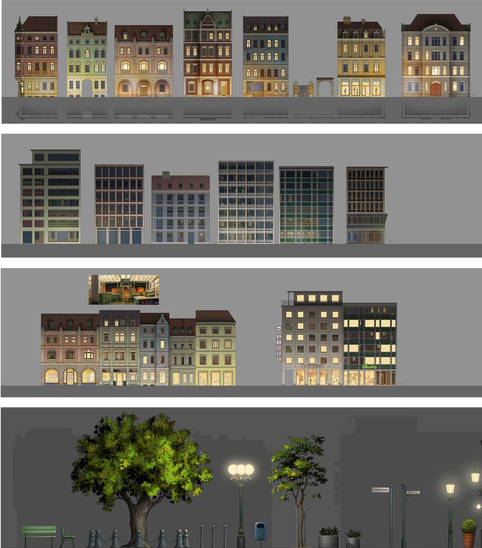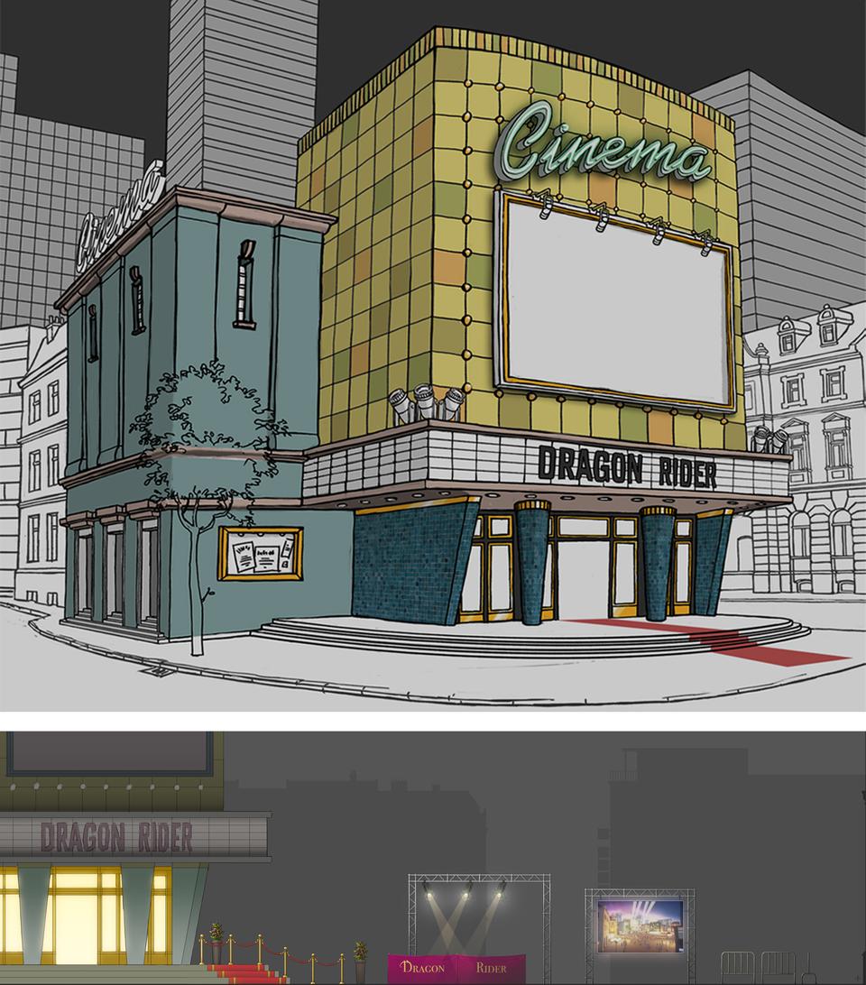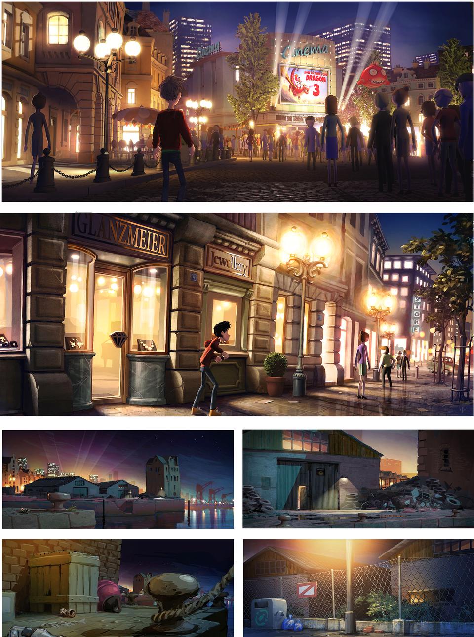 According to the script, the second set takes place in a German city by the sea. Here, too, there is no more precise information about which city is actually involved. All of the scenes here take place at night. There are two places that had to be designed. One is the harbor with an old warehouse, where Firedrake and Sorrel meet the orphan boy Ben for the first time; it is an abandoned part of the harbor, hazy and eerie. Blue-green and yellow-red shades dominate here. The other scenes take place in the city and especially in front of the premiere cinema, where Ben steals the knight's costume to escape his pursuers after he stole a necklace from a jeweler. The architecture is said to be primarily shaped by the historicist building that was common in the 19th century; but also the architecture of post-war modernism, which changed the German cityscape after the reconstruction, are included in the design concept. The architecture of the cinema is based on the newly designed building of the Zooplalast by Paul Schwebes. In contrast to the curved lines that are usually found in animated films, the formal language is strict and straightforward. In terms of color, the blue of the night is broken up by the complementary, amber-colored lantern and shop window light.