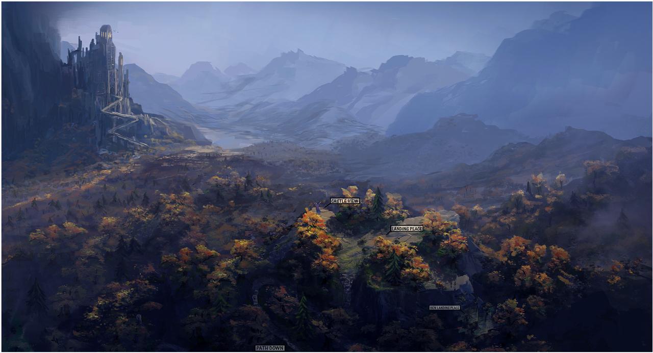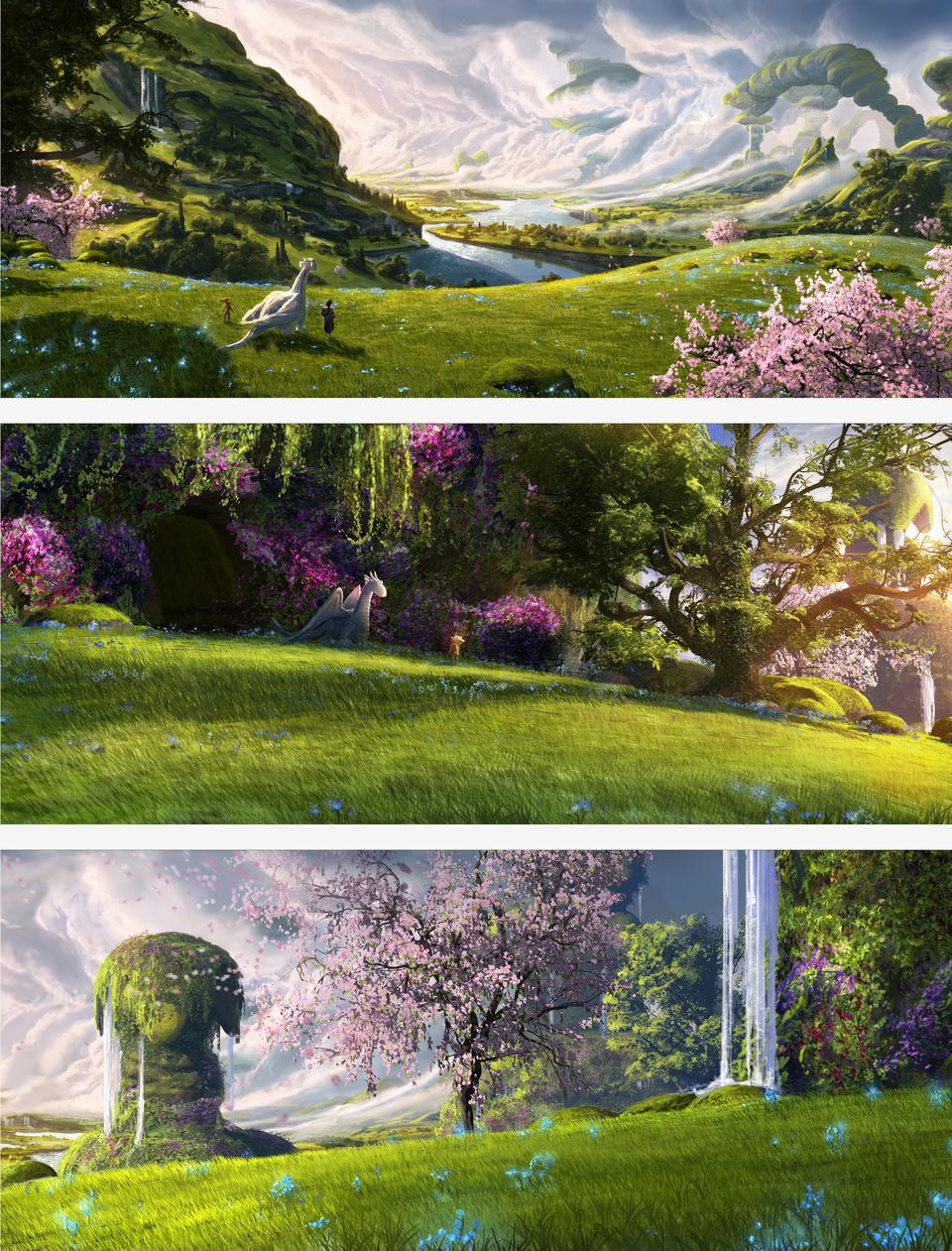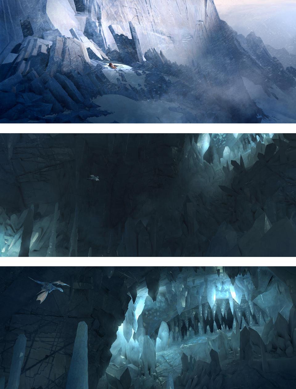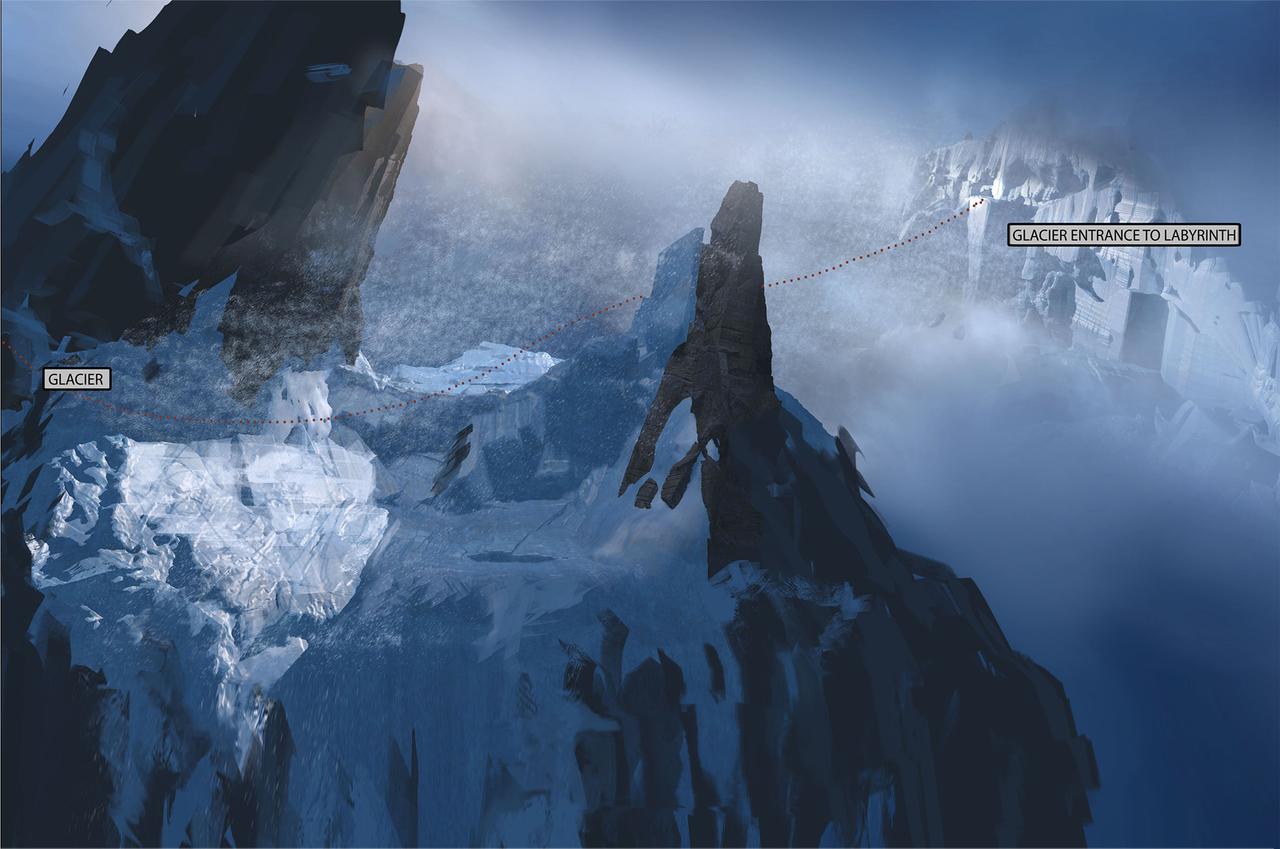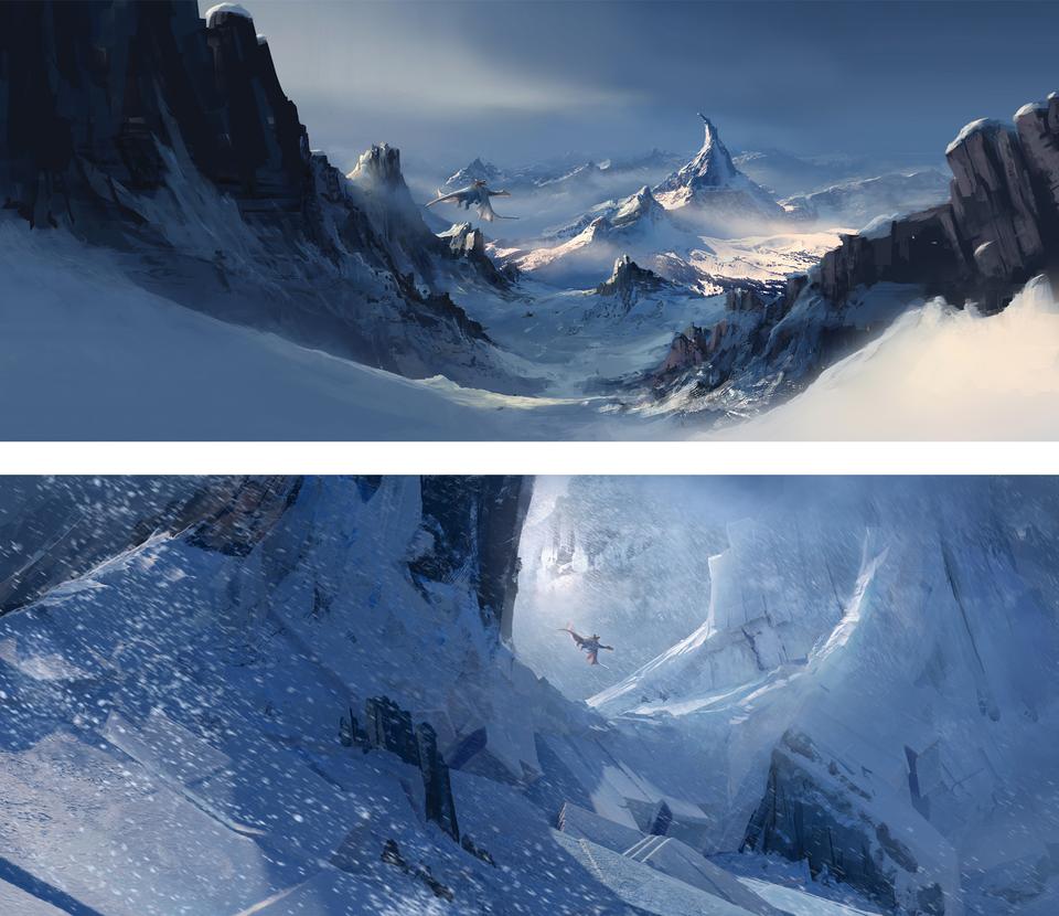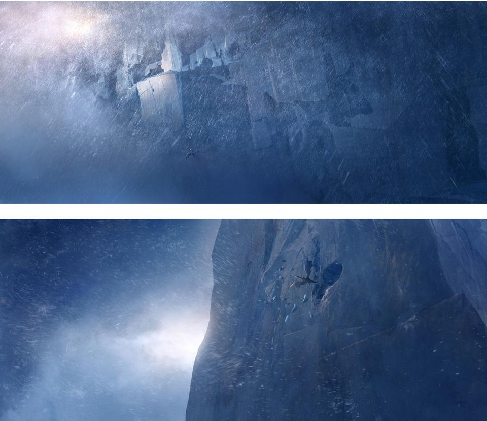 The last part of their trip takes place in the Himalayas Mountains. Stylistically, things come full circle here. The inhospitable and cold environment corresponds to the atmosphere that the Dragon Valley is supposed to suggest; rather, it seems to be even more hostile to life. Dramaturgically, a retarding moment is created here, in order to allow the audience to immerse themselves in the hopeful and fantastic landscape of the Rim of Haven after the action-packed showdown. The angular, crystal-like, almost black rock formations protrude into the sky like pointed fingers and are highlighted in contrast by the soft, cyan-blue snow banks. To escape a snow storm, our heroes take refuge in a gigantic crystal cave. The idea of telling a surreal space here once again allows the real and metaphysical world to merge further. The gate to the hall where the showdown takes place is high up on a gigantic, crater-like mountain peak. The architecture in the hall with its geometric columns composed of many small cuboids draws its analogy from the rock formations and thus looks like a part of the mountain itself; ancient and out of this world. After the magical secret exit in the hall has opened, our heroes step out and enjoy the vastness and freedom of the Rim Of Heaven. For a brief moment a place of hope is revealed to the viewer. Lush green meadows and gentle valleys; crystal-colored waterfalls and colorful flower borders; everything is embedded in a soft sea of clouds, which is supposed to protect this magical place from intruders like a gigantic barrier.