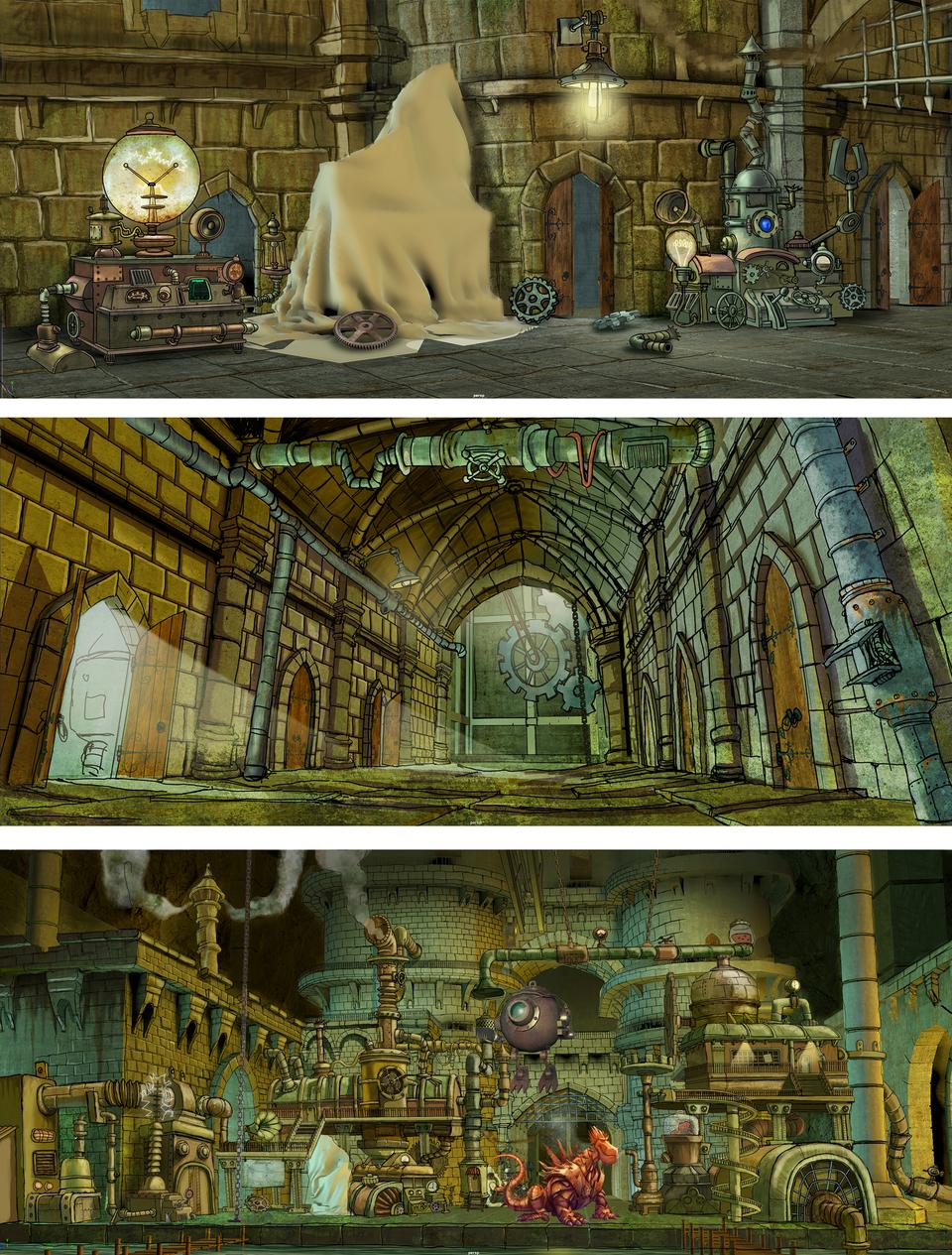 In this set, the antagonist Nettlebrand and his helpers are introduced for the first time. The scenes there take place outside in a mountain range and in a forest on a hill, where our heroes land, and once inside the castle of Nettlebrand. The whole scene is supposed to appear mystical, ghostly and, in keeping with the dwarf characters and the homunculus Twigleg, in an ironic way reminiscent of the black and romantic imagery of the Nibelung saga. Nettlebrand's castle, whose Gothic, sacred architecture is supposed to be reminiscent of the neoclassicism of a Neuschwanstein, sits enthroned in front of a mountainside like an ominous threat. This architecture is broken up by steam engine-like elements that are supposed to make the building appear like a living monster. This scene also takes place at night. In order to stand out from the cityscape and to support the mystical atmosphere, the light should be given a surreal character by means of light gobos. Fog and autumn leaves also support this atmosphere. The hall in which Nettlebrand resides is reminiscent of a sacred nave that has been badly damaged over the years. Here, too, style elements similar to steampunk are installed everywhere, which are intended to illustrate the transformation of the building by the magician Pestrosius.The dungeon halls in Nettlebrands Castle are intended to illustrate the size of this building once more. The fantastic representations of the dungeon halls of Piranesi served as a model.