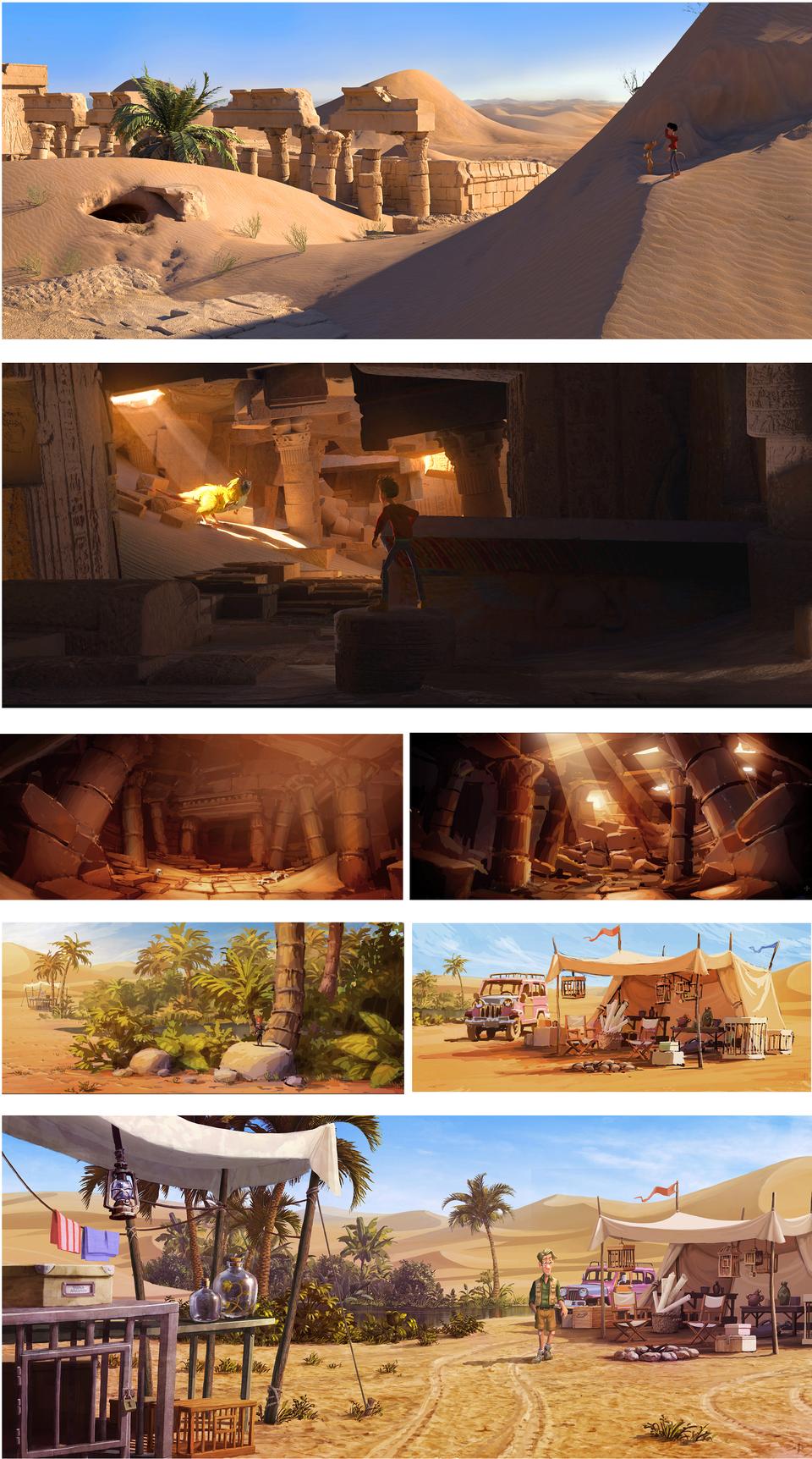 After our heroes have escaped Nettlebrand for the first time, they involuntarily end up somewhere in the middle of a hostile desert. The scenery essentially consists of three locations. A dilapidated, ancient Egyptian temple complex in the style of the double temple of Kom Ombo, the tomb below where our heroes meet the basilisk and the oasis where the professor has set up a camp with his mythical creatures.The whole setting is strongly stylized. The temple complex is unusually located in the middle of a sea of dunes that stretch like an endless sea to the horizon. No civilization far and wide. This is intended to make the hopeless situation of our heroes even more clear. Strong ocher / brown tones dominate, which should contrast with the azure blue sky.
