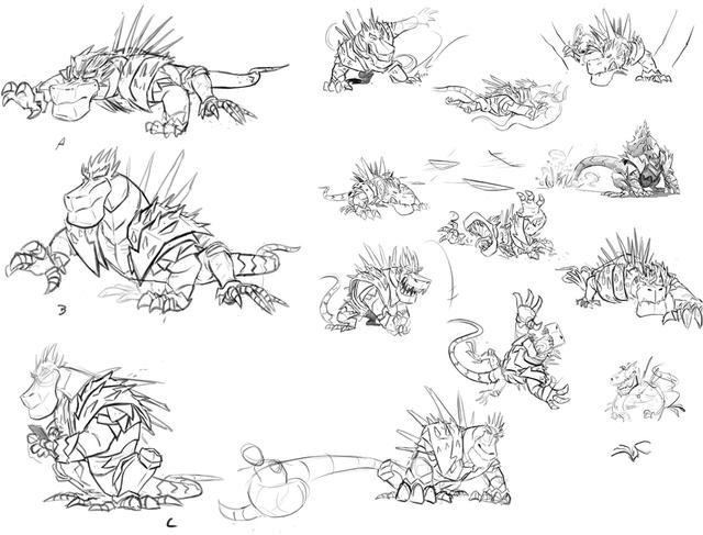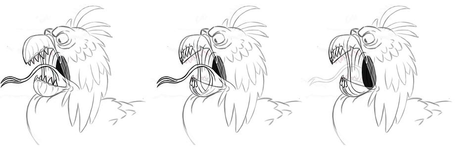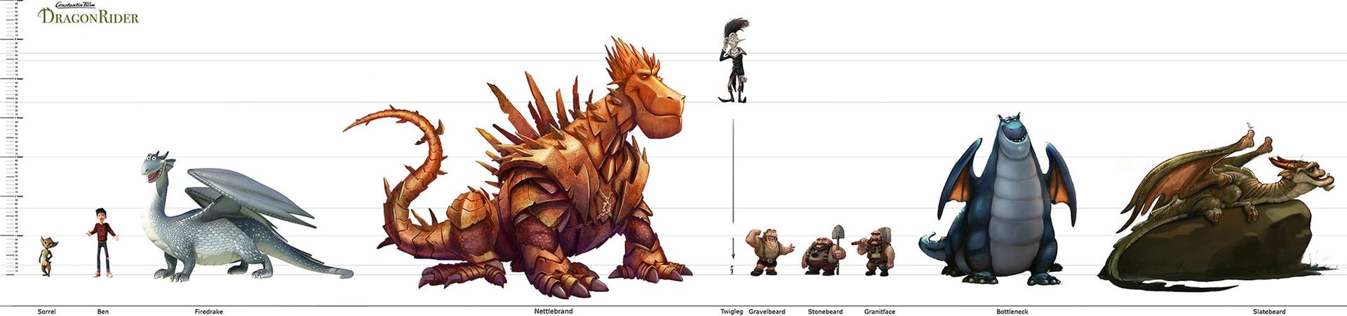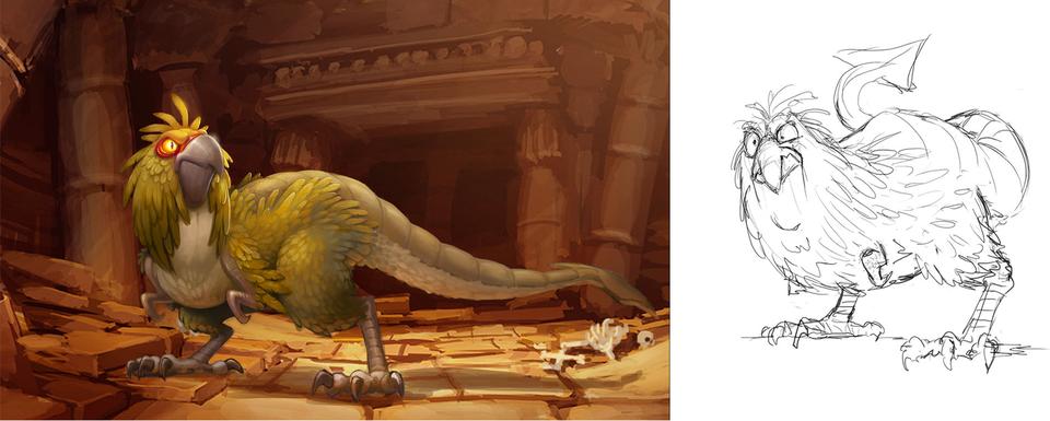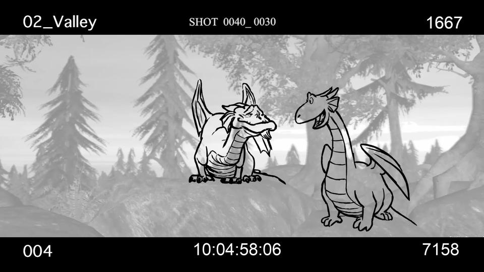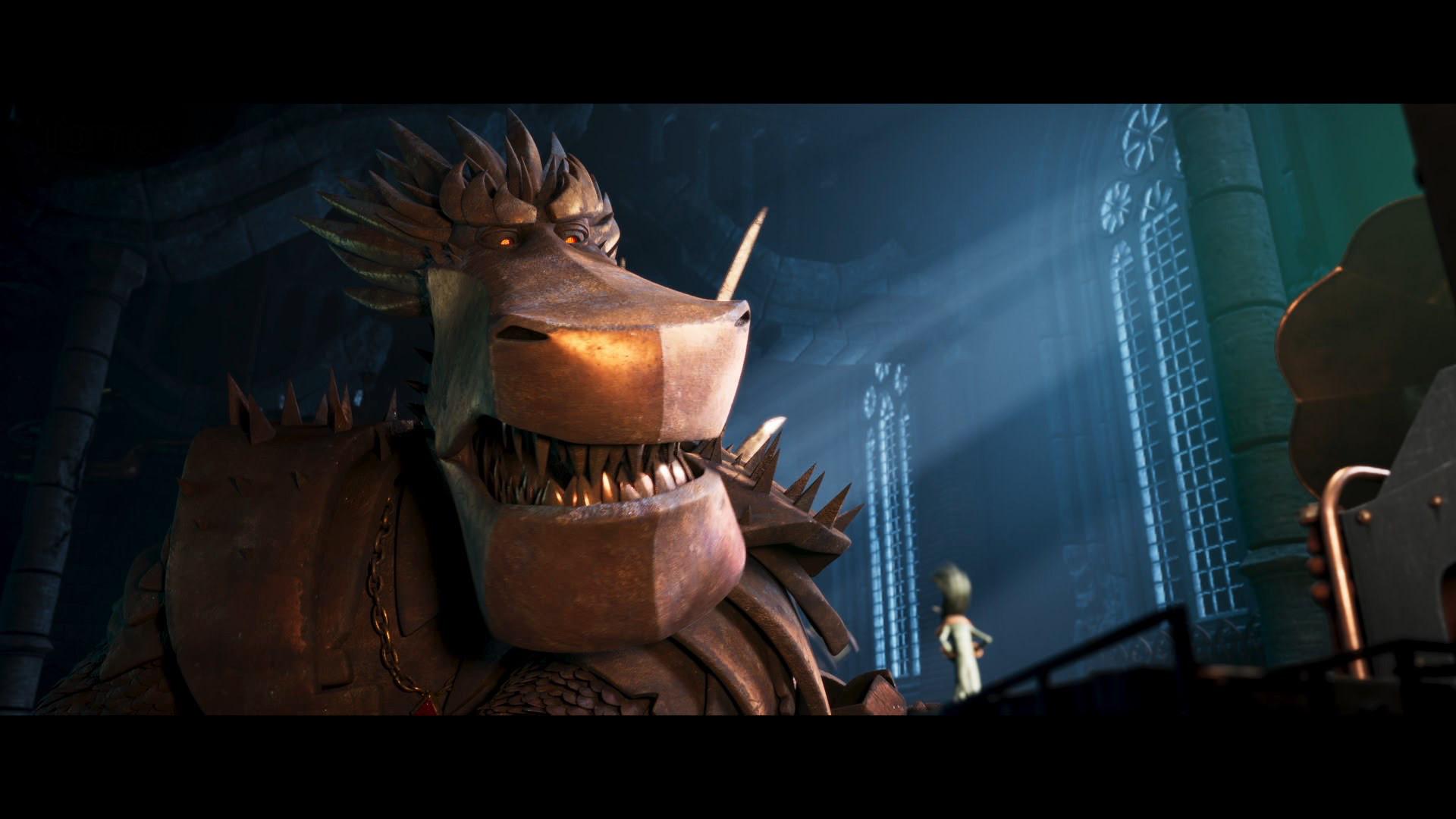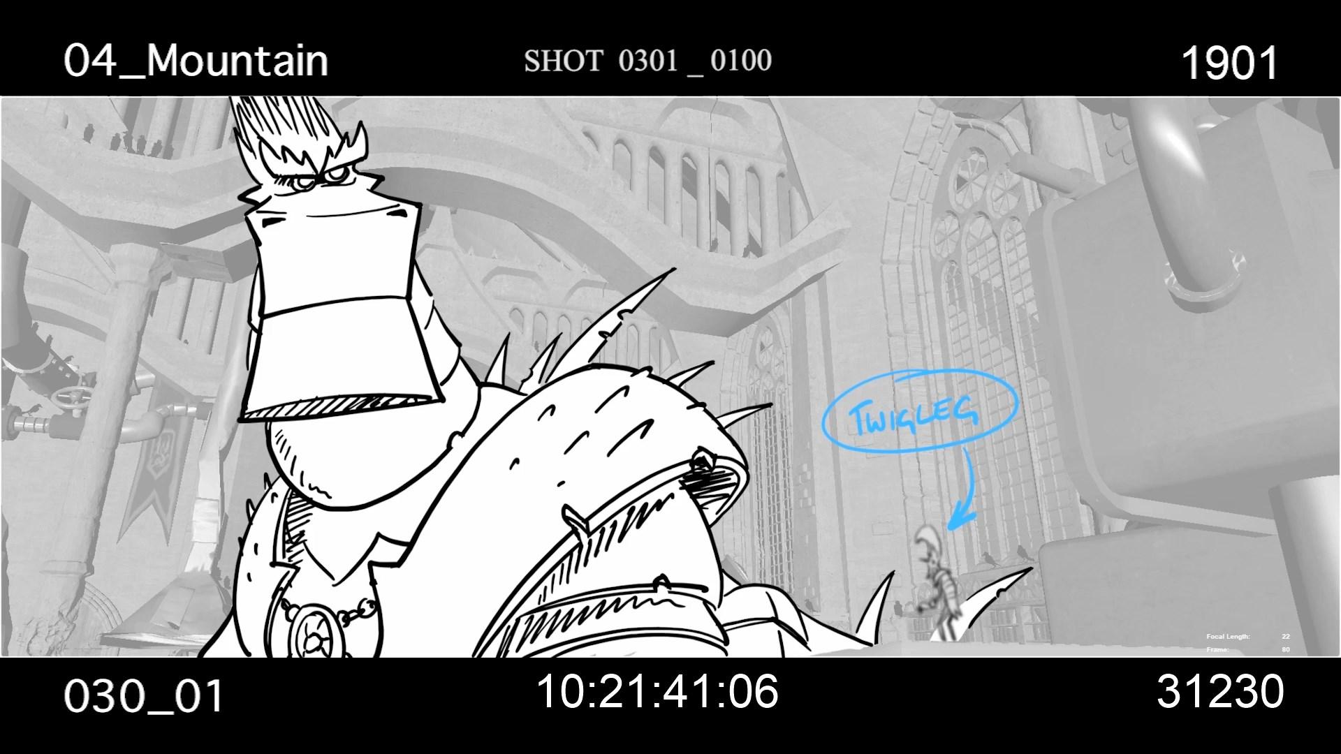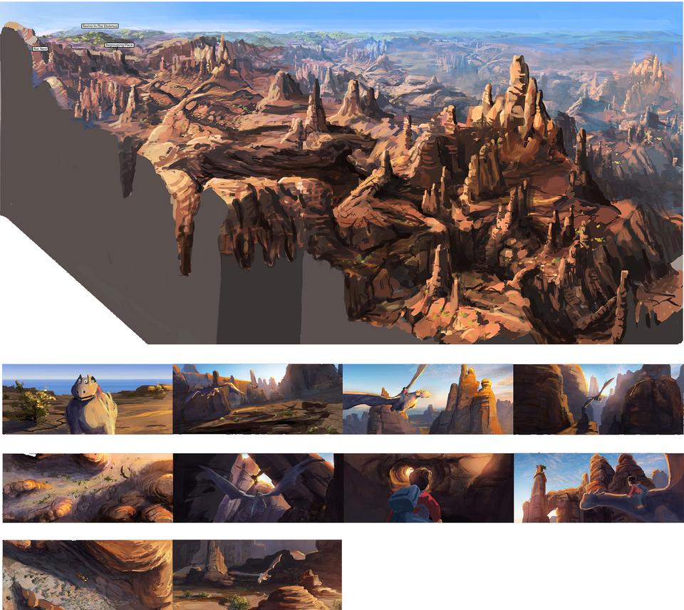 After the arduous odyssey through world history, our heroes land on a barren stretch of coast. Here Sorrel is kidnapped by a huge bird of prey and an action-packed chase begins. Right from the start, the set was designed as a kind of natural obstacle course. Since the bird of prey is reminiscent of a giant bald eagle, the decision to design the set in the style of the Grand Canyon in Arizona was only an obvious one. The challenge for the layout artists was to design the chase in such a way that the viewer gets the feeling of flying higher and higher until Sorrel plunges into the depths at the highest point to be rescued by Firedrake just above the bottom. For this purpose, a library of modular layout geometries of the rock formations was built, which could be moved as desired. The reddish-brown rock formations stand in stark contrast to the colors of the following set.