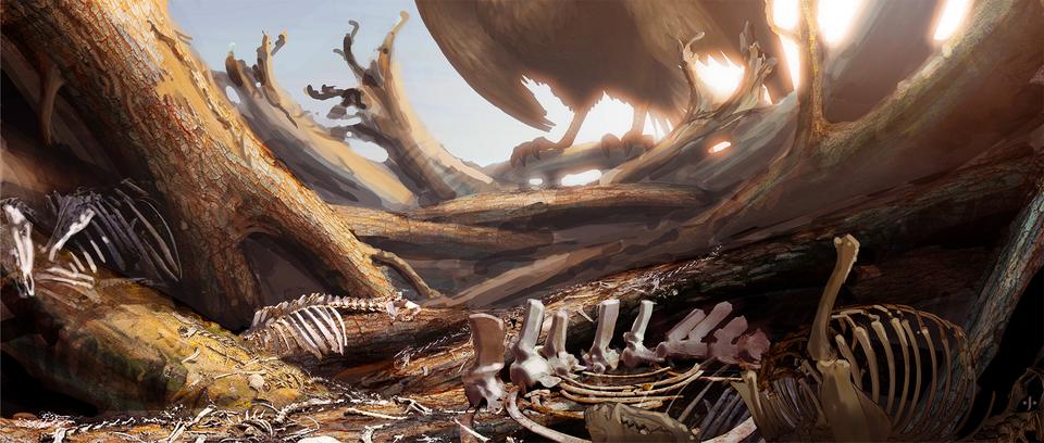 After the jubilation over the victory over the Roc-eagle, a gigantic jungle landscape with deep, overgrown gorges that seem to disappear in the subtropical haze opens up to our heroes on a high plateau. This is the place the professor spoke of. The Ravine of the Djinn, which is supposed to answer your question about the place where the Rim Of Heaven should be. They fly recklessly into the gorge to brave the next danger. The set represents a canyon overgrown by subtropical plants, which ends in a kind of arena in which the fight with the Djinn takes place. Warmer green tones dominate to stand out from the color palette of the Dragon Valley. The heroes have to fight their way through swampy waters and lianas. The steamy, hot atmosphere should literally be felt. There is an old beetle in the arena where the Djinn lives. Around the car are scattered relics of former enemies who fell victim to the Djinn.