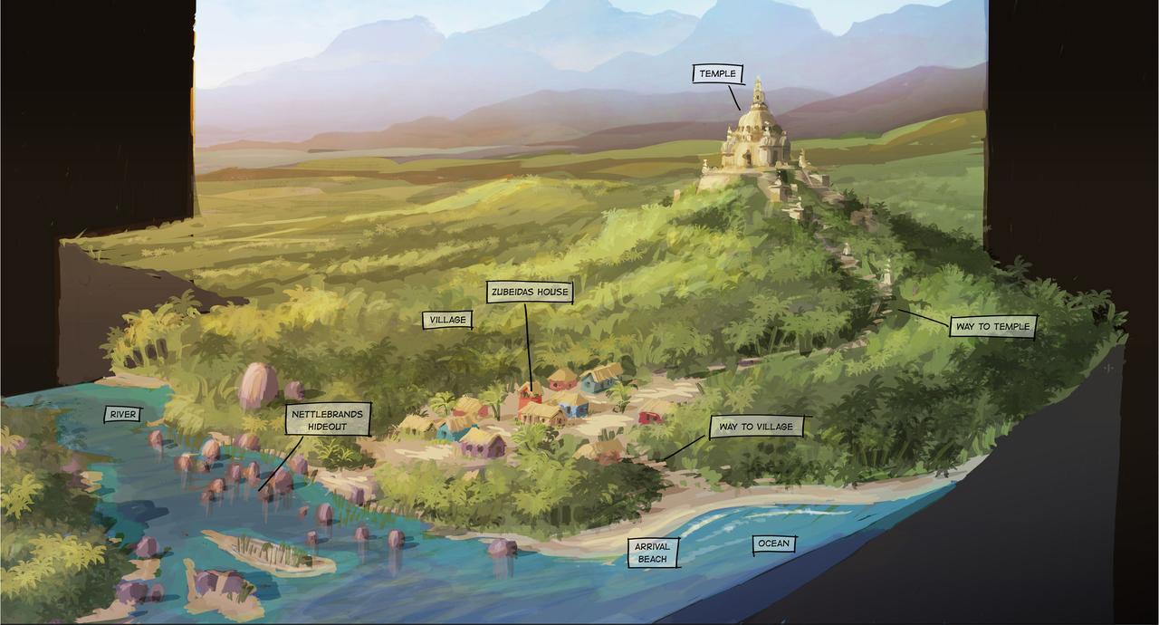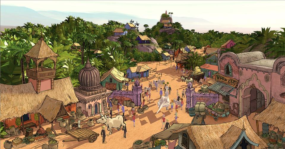 After narrowly escaping the dangerous Djinn, the heroes continue their journey to India. In a bay they head for the village where the seer Subisha Gulab lives. The temple in which the story of the dragon rider is told is enthroned high up on a hill. With its vegetation, the bay is reminiscent of Kerala in the south-west of India. Conceptually, the village should look poor and improvised, but with its brightly colored colors it should set itself apart from all other sets, especially the very monochrome Himalayas set that followed. The architecture of the Dragon Rider Temple is based on the style of Hindu buildings of the 10th and 12th centuries, with its classic tower structures consisting of the slightly curved temple tower Sikhara and the underlying, separated Garbhagriha, in which the sanctuary is located.
